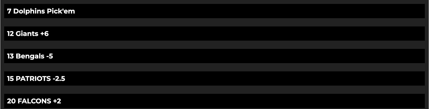 And it’s not so much the cases he made, but my reaction to them. As soon as he said it, it was like aha, right, the Dolphins! No one wants to use the Dolphins! And the Falcons are a little like that too. When you get on a roll picking games ATS, it’s always when you spot those teams on which the narrative had turned sour ahead of any real performance indicator. And these felt like good ones.