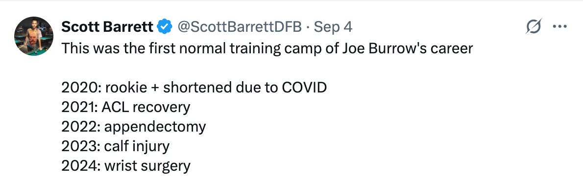 The third was the Bengals. There’s a narrative that Joe Burrow gets off to slow starts, but as Scott Barrett pointed out, there were reasons for that in years past, and no reason for it now. This is also a short road trip (in state), and they’re facing a 40-year old Joe Flacco who wasn’t even great at his peak.