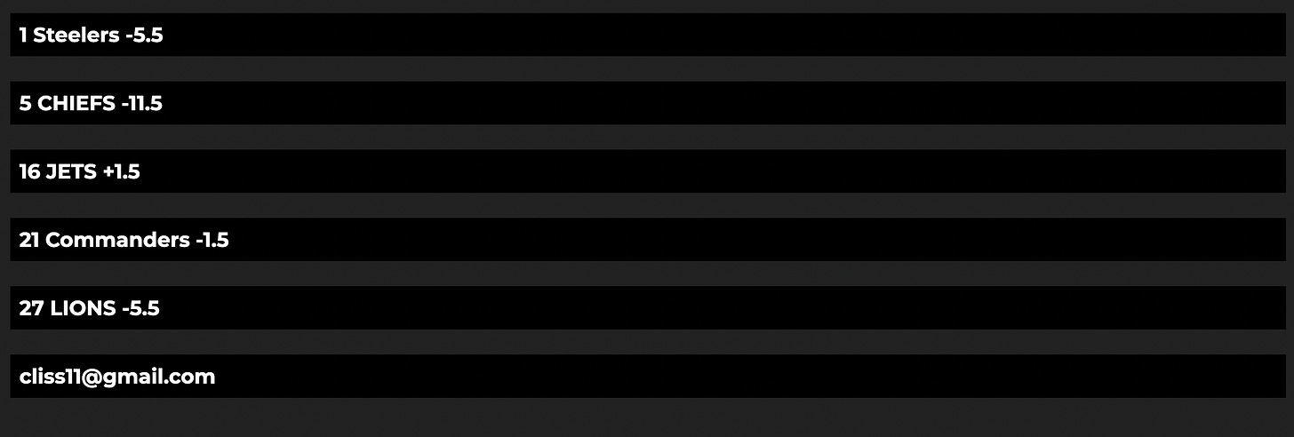 Got an email from the proxy saying if you don’t get you picks in on time, they would select them at random. This is not only a good policy from the proxy — why not pick for you at random rather than fail to submit? — but it might be advantageous for me to roll the dice, given how poorly I’ve picked so far this year. That said, tempting as the offer was, I made my picks anyway because you have to be wrong with intent to learn something. You can’t learn from random.