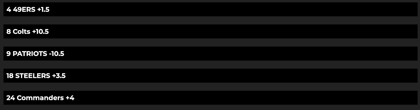 This is the exception to my rule of taking the team that’s going home against the team with something to play for in Week 18 as it looks like the Dolphins might sit their whole team with Jaylen Waddle, De’Von Achane and Darren Waller banged up. The first two might play, but I could see them getting pulled early. Plus this is a Miami team going into a cold weather venue in January.