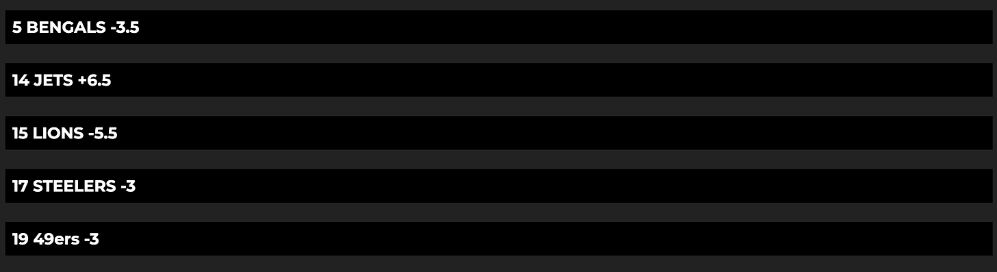 I also like the Bengals. Those 3.5 point lines make me lean favorite as they’re begging you to take the dog. Also, they will get Ja’Marr Chase going this week.