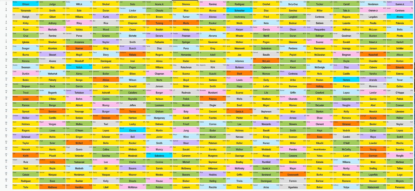 12.9 Ranger Suarez — I missed out Luis Castillo by a few picks, so I settled for Suarez. Pure projections play, as I needed to get some solid innings eaters to backup Skenes and Woo.