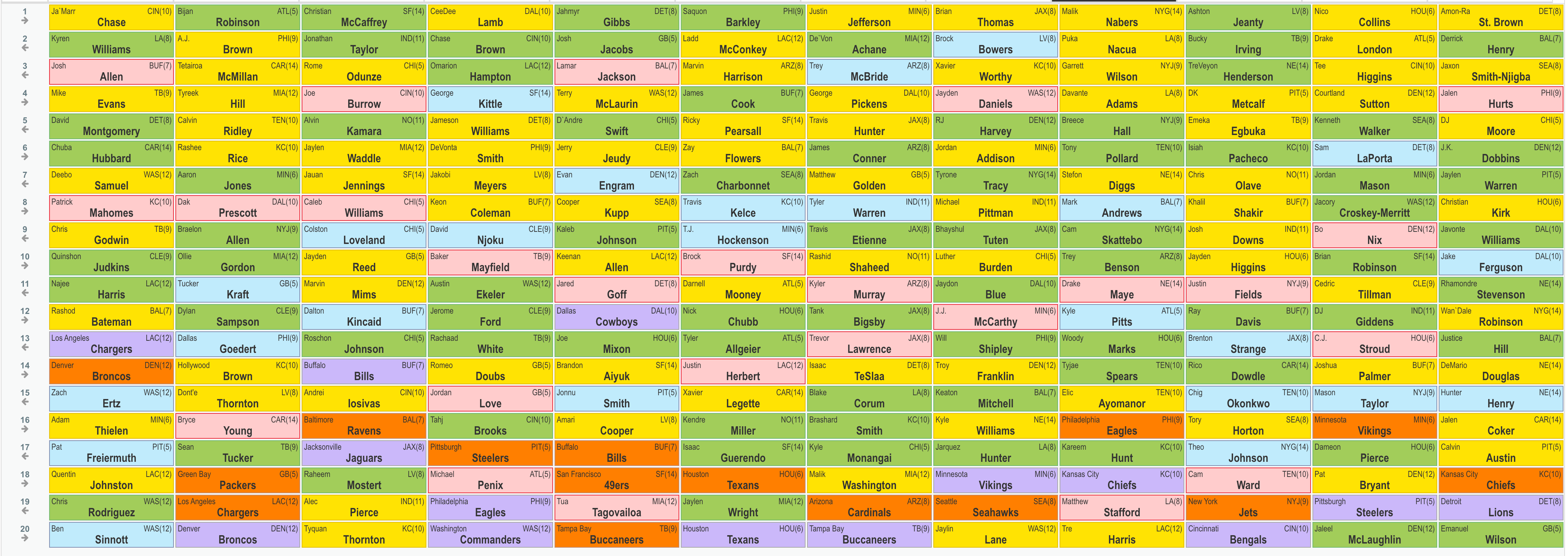 2.4 Puka Nacua — I was all set to take Brock Bowers when I planned it out, but just yesterday had an epiphany that De’Von Achane (who I’ve faded all summer) had to be the pick. Yes, he had a calf injury that could flare up, but otherwise, he might catch 100 passes with Jonnu Smith gone. So my preference was Achane, then Bowers if someone jumped Achane a few picks. But in the back of my mind I told myself, that was only assuming that prior tier of receivers (Thomas, Amon Ra St. Brown, Nico Collins, Drake London and Nacua were gone.) Usually you’re looking at Derrick Henry, Chase Brown, Bowers or Achane with 2.4, but Nacua fell, and I pivoted. I’m ambivalent about doing so because I was excited to roll the dice on Achane, but I never would have considered Achane had I thought one of the WR would be there.