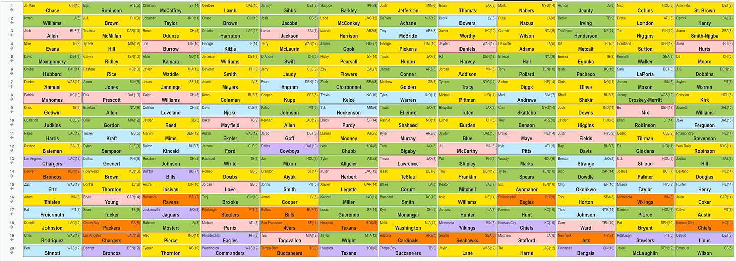 4.9 Davante Adams — I had faded Adams all summer, but opted for a share here ahead of Kenneth Walker and Courtland Sutton. I like Walker’s skills, got a share in my beat Alan Seslowsky draft, but I feel like I got talked into it by reading too many “sharps” who are “all in” on Walker. I don’t regret drafting him in Round 5 in that league, but I am not all in, so I passed. Sutton I have two shares of already, and I like but don’t love him. So I went with the ADP faller, Adams, who pairs nicely with Nacua. If either get hurt, the other should be a top-five WR for that stretch, and if Adams is old and washed up, Nacua will smash. Plus I knew I could get Matthew Stafford for free at the end for a playoff stack. In other words, it doesn’t hurt to start both, and I get the insurance for free.
