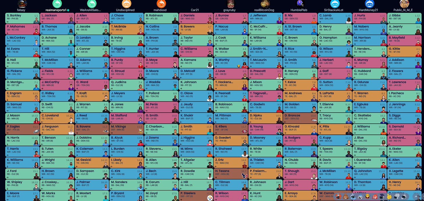 I did the Stacker_Sports, part of Stacker_News, draft last night. It was a 12-team, half-PPR, QB-flex league, drafted on Sleeper. The crazy thing about the draft is it was set to 30 seconds per pick which made for a frenzied pace where it was hard to keep up via your cross-off list.