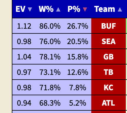For me it’s the Bills or the Falcons, and it’s a question of use the best pot-odds-adjusted team, don’t think twice, or trust your instincts knowing you are going to have to get by on instincts a lot to make it to the end of the year. Yes, you are taking more risk, per the market, but if you’re just going on pot odds you’re basically saying you have a small edge over the field and are hoping to get very lucky. I don’t want merely to reduce my odds from 1 in 18,000 to 1 in 10,000. I want to win, and to do that I’ll have to trust my reads.