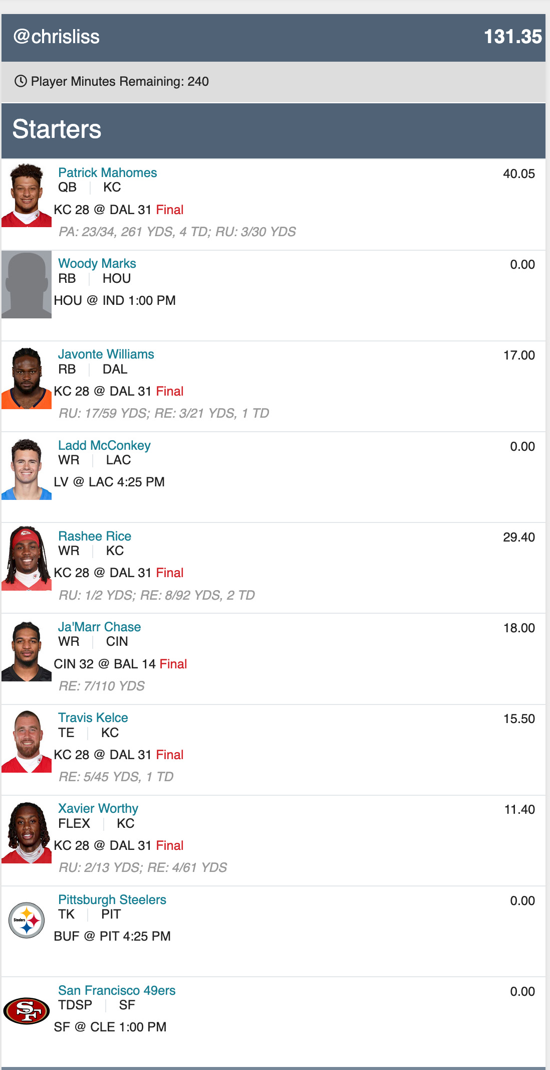 My Chiefs stack team, also on the bubble, got off to a nice start despite Ja’Marr Chase having a modest game — good chance it’s in the top-700 again (playoff line) by week’s end: