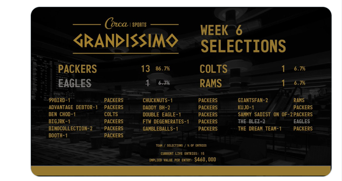 Talk about pot odds! You really, really, really wanted to be on the Colts or Rams. Could even have made a million-dollar money line bet on the Packers to win 90K or so. In fact, the Colts/Rams guys should have agreed in advance to a split wherein they either pocket the 90K each or chop two ways if the Packers lost. Only downside would be if all three teams lost, but that’s very unlikely and hedgeable via parlay. Of course, having the liquidity to do all that (and getting the book to sign off) might be a challenge. But Circa should (if they don’t already) make those services available to people with big equity in the contests.