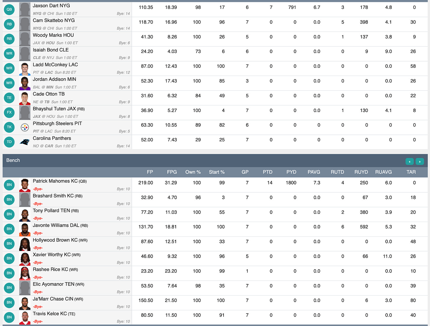 I’m not sure anyone’s ever had 10 players on bye before, but I’m hoping for 100-ish points and staying more or less on track to make the playoffs. The entire goal for this team was somehow to get in and then hope for Mahomes et al to go ballistic from Weeks 15-17. So far so good.