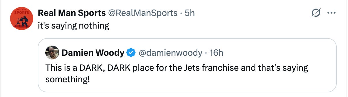 The Rams-Jaguars game was a joke. I have Brian Thomas is two non-NFFC leagues, and he was dropping passes and losing snaps to Travis Hunter. I had hopes Thomas would bounce back after last week, but he’s in his head now, and Trevor Lawrence is terrible. He’s the Kyler Murray of the AFC, the former No. 1 overall who only keeps the job (and got paid) for that reason. Mac Jones is better, just like Jacoby Brissett is probably better.