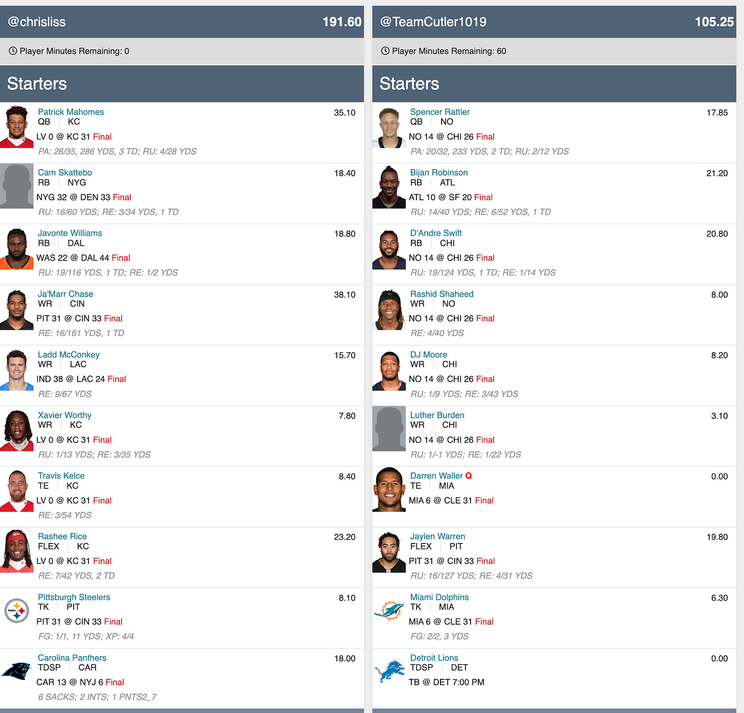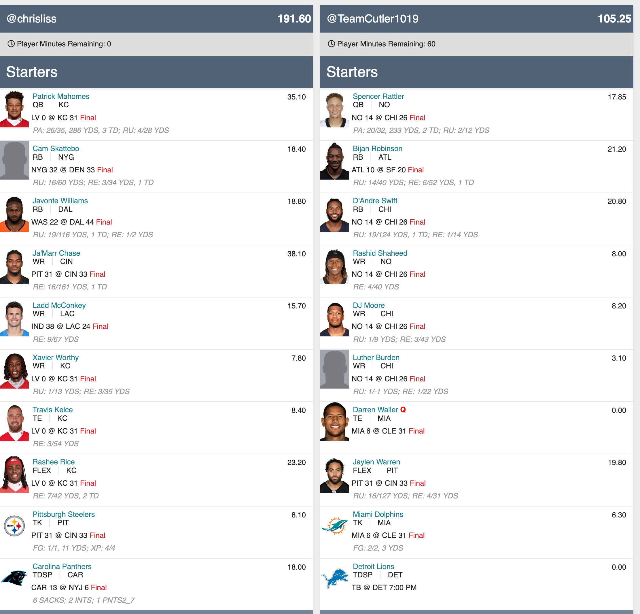 My Chiefs stack team scored nearly 200 points, despite their pulling their starters for the entire fourth quarter.