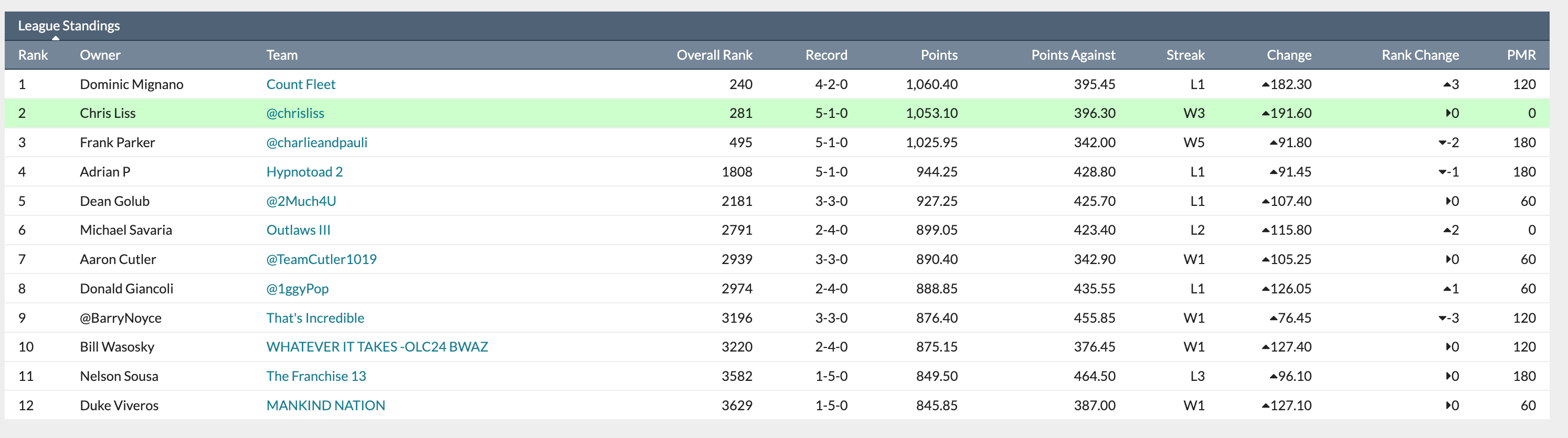 As it turned out, Rice was suspended concurrently with Addison, so I was starting Hollywood Brown in Week 1 (worked out fine), and my ninth and 10th-round picks were Javonte Williams and Cam Skattebo. I was hoping to be 4-3 or so at this point, have Rice and Addison back, make a run and sneak into the playoffs. Instead, here’s how things stand: