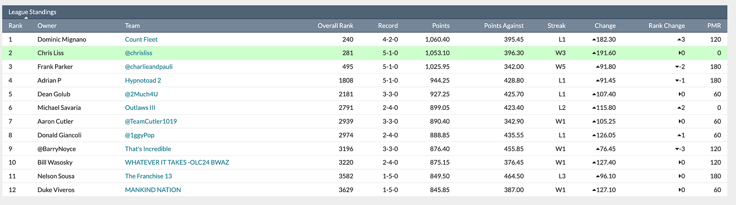 My Primetime team, by contrast started out 4-0, then lost Malik Nabers (1.9), Puka Nacua (2.4) and Garrett Wilson (3.4.) Still I managed 137 points with Woody Marks to go, but I’m a steep dog tonight with the other team having Jared Goff, Jahmyr Gibbs and Cooper Kupp, down 29. It’s a sad fate for what was once a serious juggernaut.